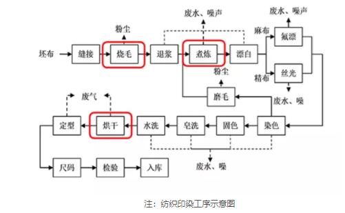 紡織印染的主要流程分為3步:前處理、染色印花、后收拾,其主要工序有燒毛、退漿、煮煉、漂白、絲光、定型、烘干和染色等。鍋爐是紡織生產(chǎn)線設備中的一員,用來帶動烘干等設備,并在壓片、燒毛、退煮漂、定型、染色等環(huán)節(jié)中供熱。